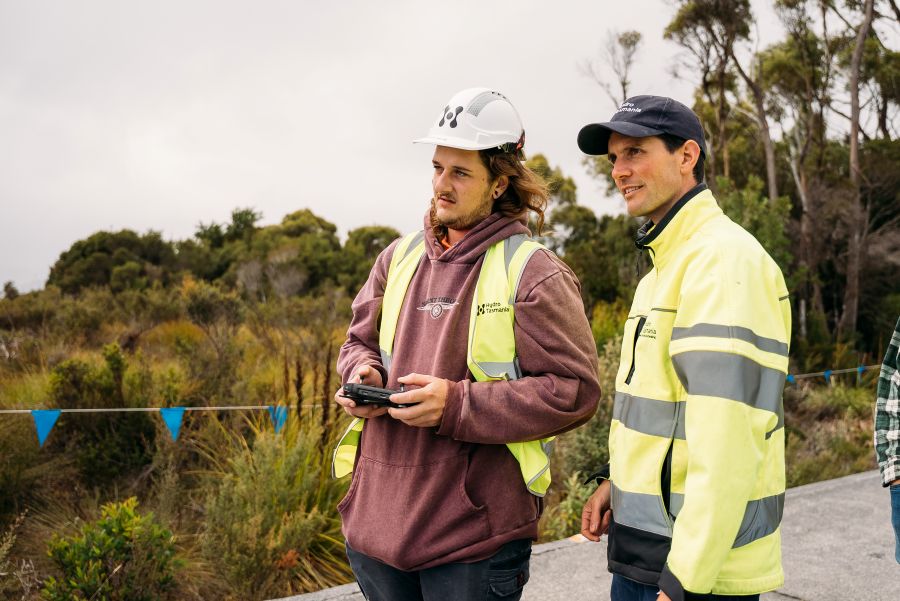 The second day of the program took participants to Edgar Dam, part of the Gordon-Pedder hydropower scheme in the wild South-West. Participants shadowed professionals from Hydro Tasmania and Halls Earthmoving, gaining experience in a range of roles from dam maintenance and civil construction to environmental management and drone flying.