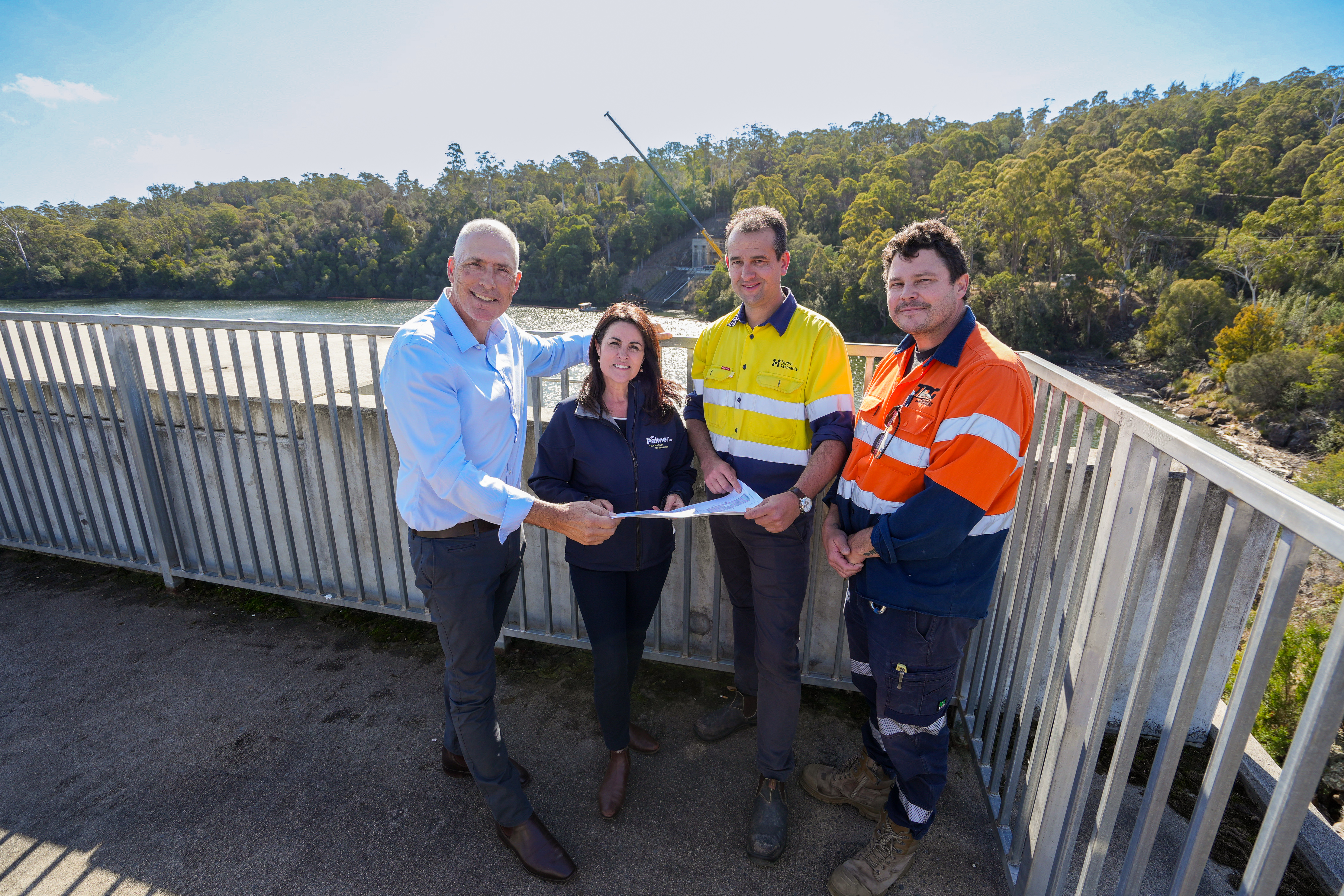 (Pictured in front of the newly installed trash rack: Minister for Energy and Renewables Nick Duigan, Jo Palmer MLC, Jesse Clark Executive General Manager Assets and Infrastructure at Hydro Tasmania and Lachlan Osborne, Tasmanian Divers Group)