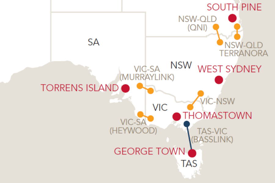 The NEM spans the east coast of Australia, from south-east Queensland, through New South Wales, Victoria, South Australia and across the Bass Strait to Tasmania. Each state has its own ‘grid’ – the poles and wires that keep the electricity moving to where it needs to go. Each of these grids is connected via an interconnector.