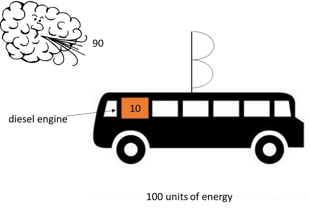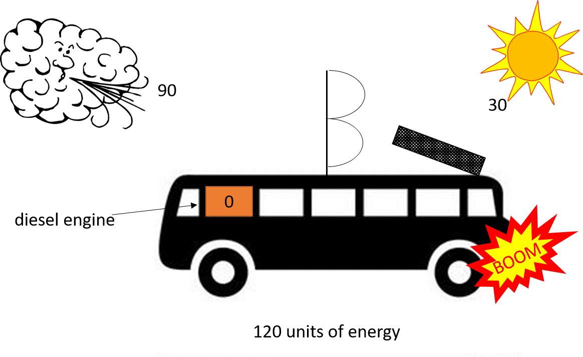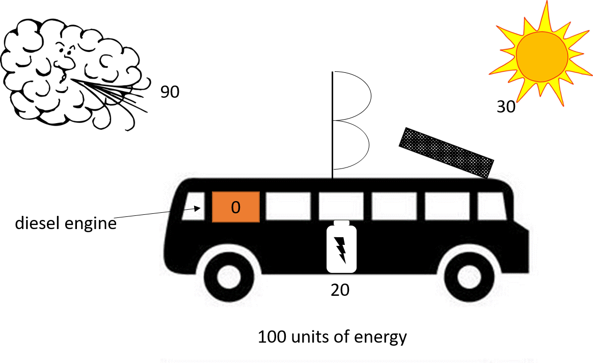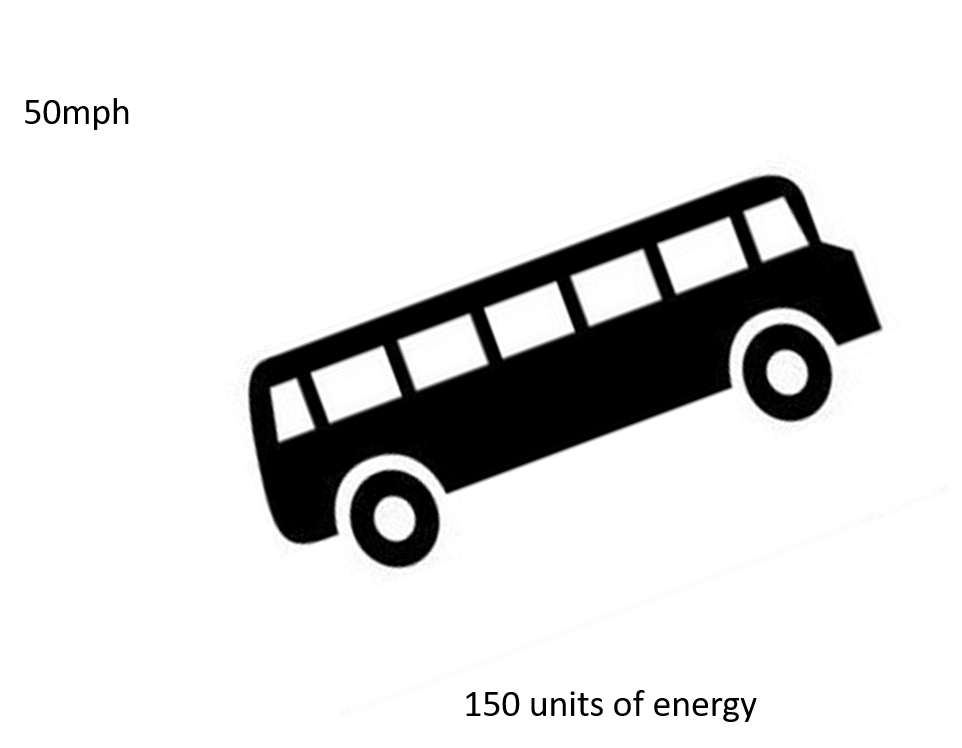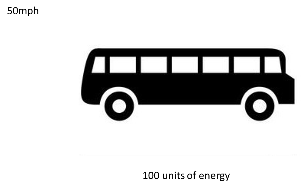 Back to the bus. Imagine there are now 50 units of energy coming out of the wind. This means the bus’s diesel engine can reduce its workload as the bus only needs 50 units of diesel energy to have enough units of energy (100 units) to maintain its speed of 50mph. Now the wind increases and all 100 units of energy can be provided by the wind. Excellent thinks Sandra, let's turn this noisy engine off.
