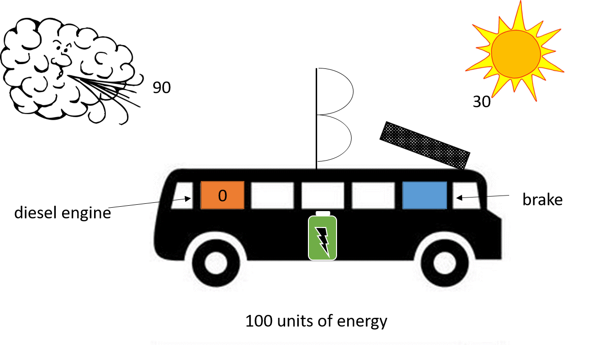 Now that the bus has a battery if the wind drops off by 50 units and the sun disappears again there is no need to increase the amount of energy coming from the diesel engine as any shortfall can be made up with energy from the battery, at least until the battery is empty.