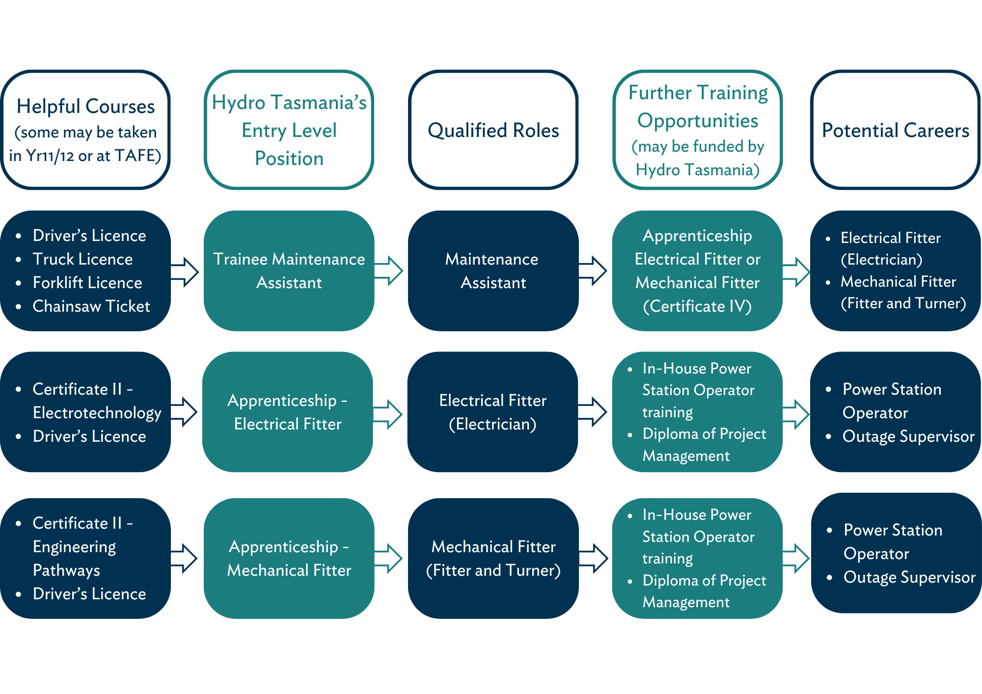 Trade positions are generally advertised annually, dependent on vacancies and can be based in various locations around Tasmania.