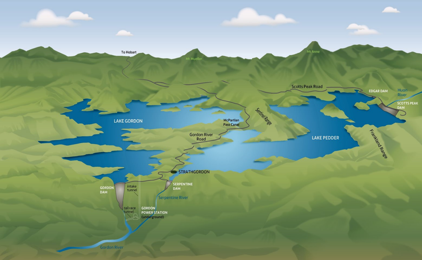 Gordon Power Station is located in the south-west of Tasmania, near Strathgordon, within the Tasmanian Wilderness World Heritage Area. It sits on Lake Gordon, which, along with Lake Pedder, forms the largest water storage in Australia. The station is about 172 km west of Hobart and is accessed via the Gordon River Road.